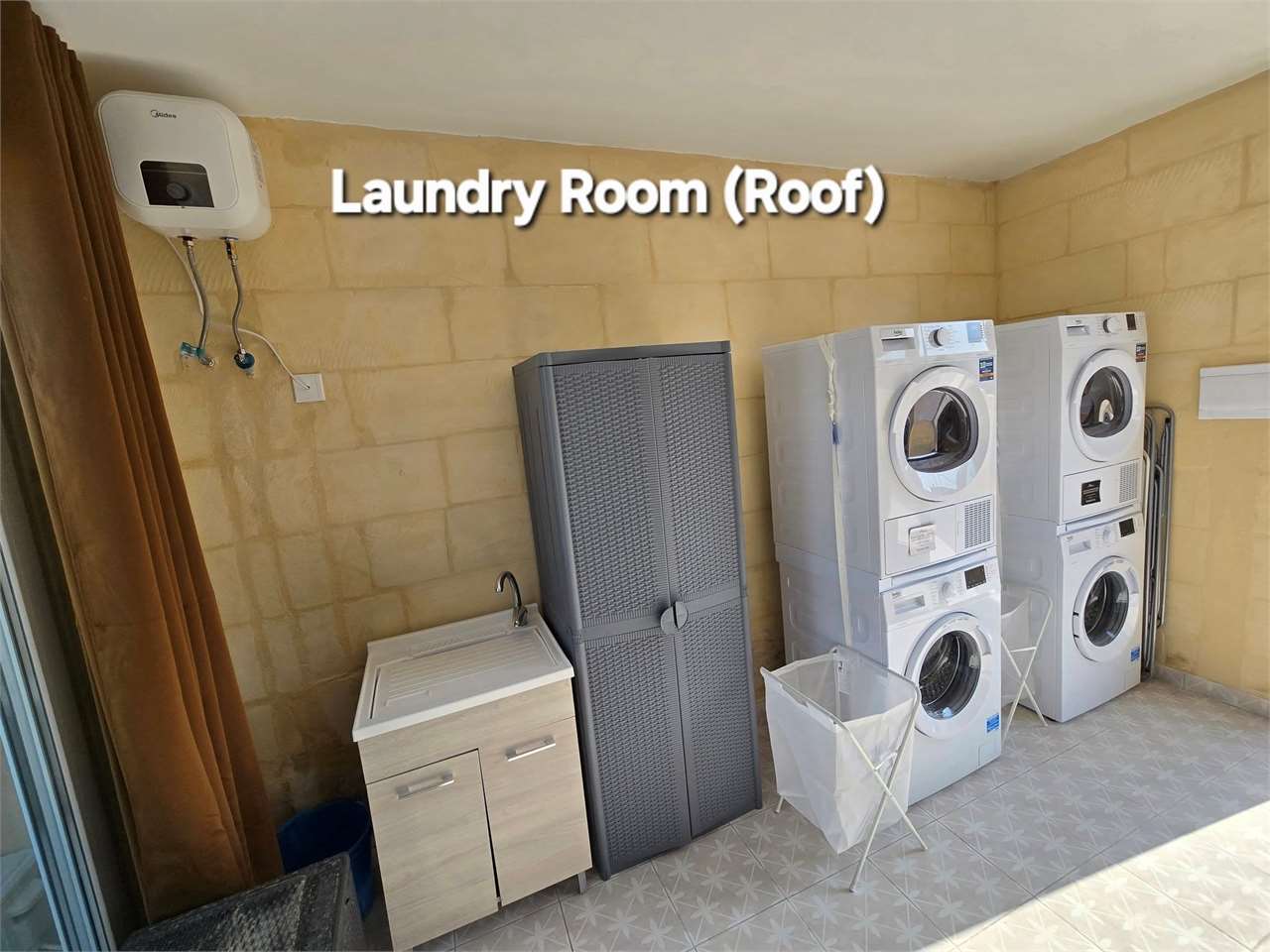 • Rooftop shared laundry room with 2 washers, 2 dryers, laundry sink, storage spaces, iron + board, and horse racks
