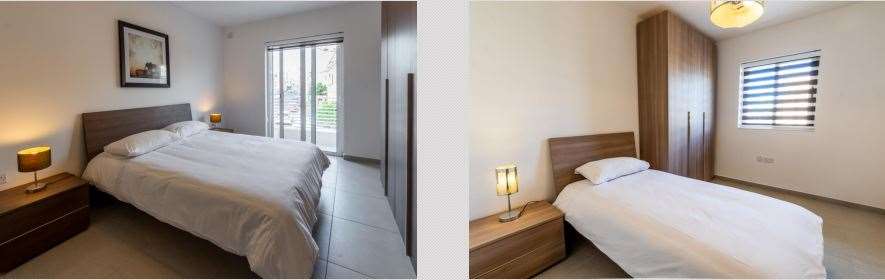 The apartment consists of a kitchen/living/dining, a small office area, a master bedroom with an en-suite, two double bedrooms with single beds, a main bathroom with a tub and a washroom.