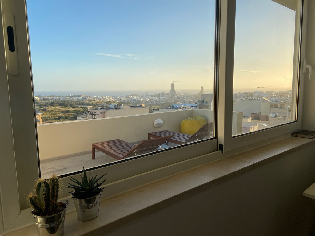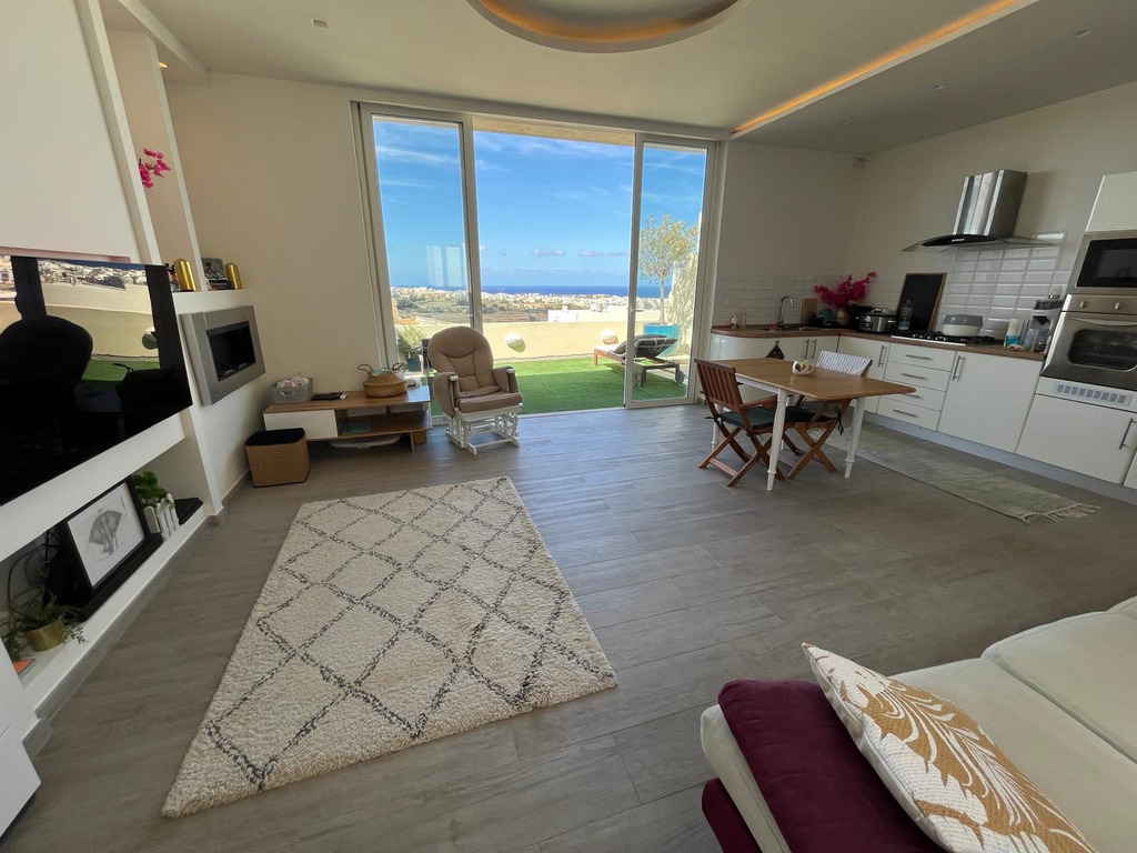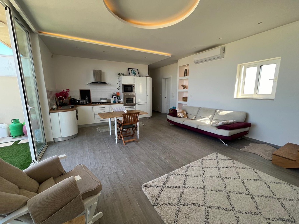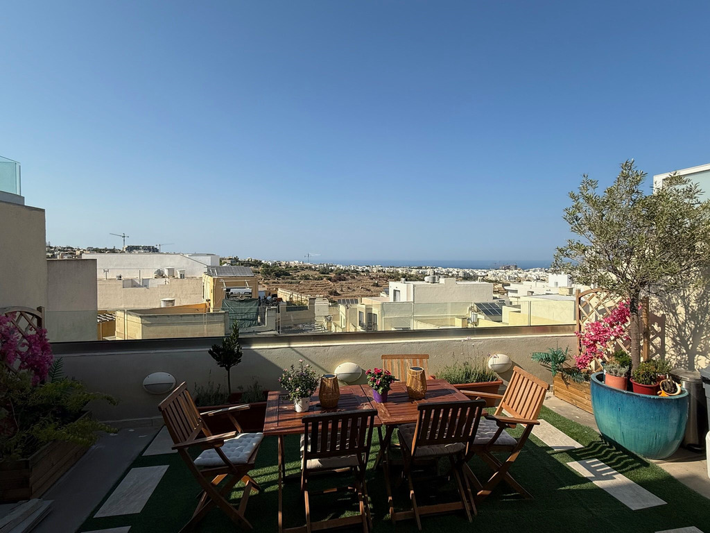 Introducing a highly finished penthouse located on the outskirts of San Gwann, enjoying an elevated position with beautiful sea and valley views. This unique residence offers an exceptional blend of indoor and outdoor living, featuring 50 sq.m of private terrace space spread across two levels, ideal for entertaining, relaxation or al fresco dining. Internally, the penthouse boasts approximately 91 sq.m of well-planned living space with high ceilings and abundant natural light throughout, enhancing the sense of openness and comfort. The layout includes a welcoming open-plan kitchen, living and dining area, a main bathroom, a master bedroom with ensuite, and a dedicated laundry room for added practicality. The property is being sold fully furnished and ready to move into, making it an ideal turnkey solution for homeowners seeking comfort without the hassle of finishing works. A rare offering that combines views, style and convenience — perfect as a residence or high-quality rental investment.