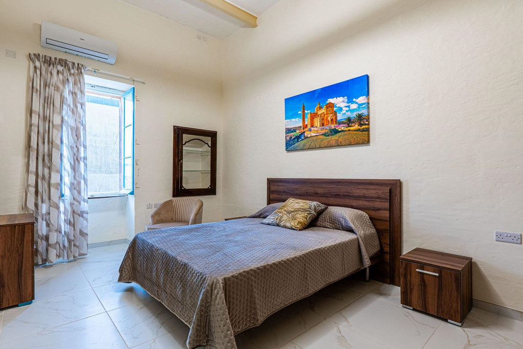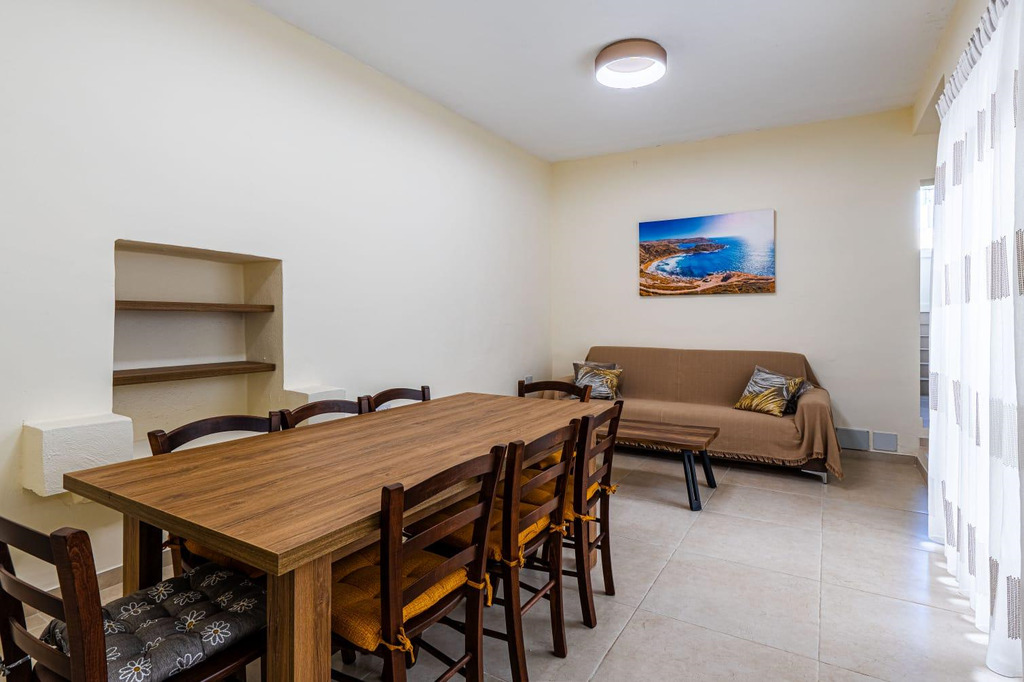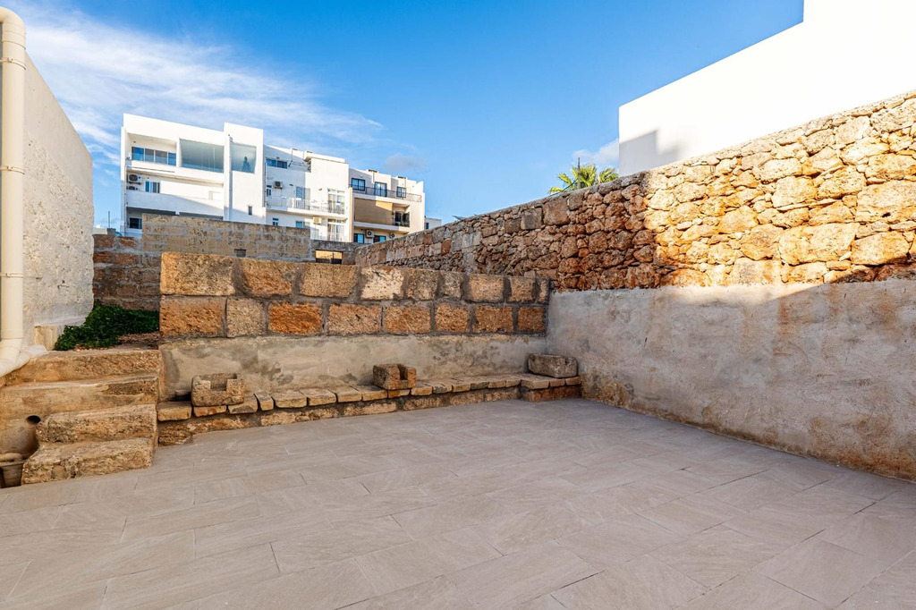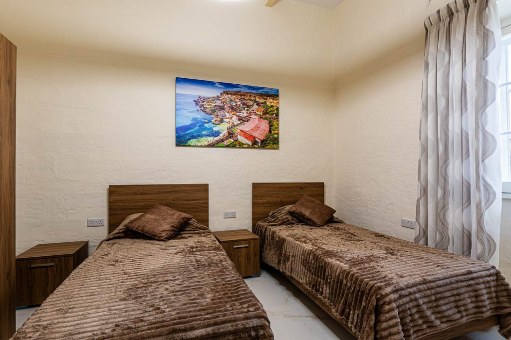 MGARR – A one-of-a-kind, 100-year-old townhouse set in the quiet countryside village of Mgarr surrounded by crop fields and located a mere 2-minute walk from the lively village square bustling with cafes, restaurants, convenience shops, stationers and a playground is on the market for rent. This modernly furnished, 8-bedroom townhouse comprises a welcoming living/dining area (equipped with a large table and 8 chairs, a sofa bed and a coffee table), a fully fitted kitchen (equipped with a built-in oven, microwave, dishwasher and an extra-large standing fridge/freezer), 2 double bedrooms,1 twin bedroom, an en suite and a separate bathroom with walk-in shower, at first-floor level; 4 double bedrooms, 1 twin bedroom and 4 bathrooms (2 with en suite and walk-in shower) at ground-floor level. The property also boasts an internal yard adjacent to the living room (ideal as a BBQ area), a larger backyard partly split by a rubble wall with permits in hand for a pool and sunbed area, high ceilings, beams, thick walls, a staircase with wide steps, rubble walls, a large well outside, open shelves dug into the walls, curtains and air-conditioning in all bedrooms as well as the living room. An exceptional home ideal for large families, as a boutique guest accommodation or anyone seeking a unique countryside residence abounding in character and space.