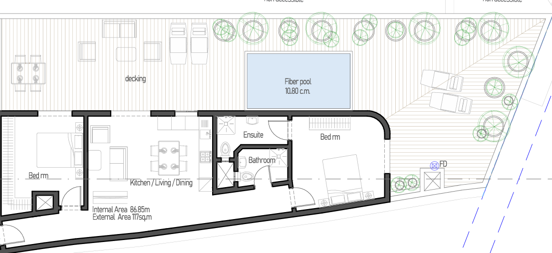 Fgura corner 2-bedroom penthouse on plan facing ODZ, featuring an open-plan kitchen, dining, and living area, a main bedroom with ensuite and a bathroom. This property boasts a spacious and large corner terrace with pool, ideal for outdoor living and entertaining. This Penthouse will be sold in shell form with all common parts ready and is estimate to be ready by end of 2027. Optional garages are available at an extra price.