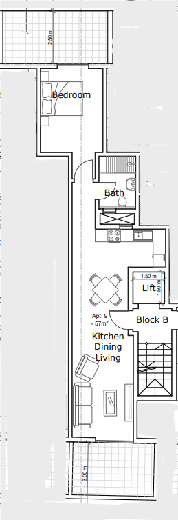 The layout includes an open-plan kitchen/dining/living area, main bathroom, master bedroom and a spacious front and back terrace of circa 22sqm, making it ideal for entertaining.
