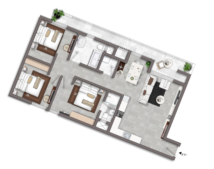 Consists of an open plan kitchen/dining living, three double bedrooms with the master having an ensuite, main bathroom and a balcony connected to all rooms on the left hand side of the apartment, providing ample of natural light.