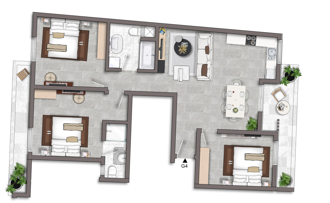 Consists of an open plan kitchen/dining/living complemented by a front terrace, main bathroom, three double bedrooms with the master having an ensuite and a private balcony.
