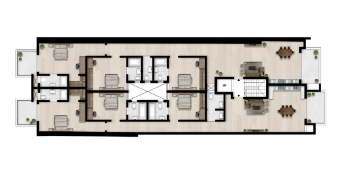 It consists of an open-plan kitchen/dining/living with a front terrace, a main bathroom, and three double bedrooms, all with ensuite bathroom. The master bedroom also features a walk-in wardrobe and has direct access to a terrace.