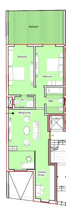 The layout comprises of an open plan kitchen/dining/living, main bathroom, two double bedrooms connected to the backyard. Master bedroom includes an ensuite bathroom.