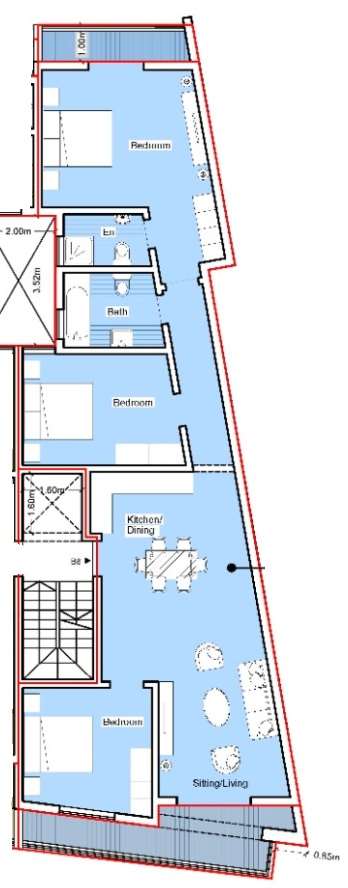 The layout comprises of an open plan kitchen/dining/living with a front balcony, main bathroom, and three-double bedrooms. The master bedroom includes an ensuite bathroom and is connected to a balcony.