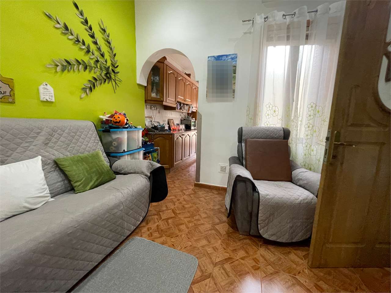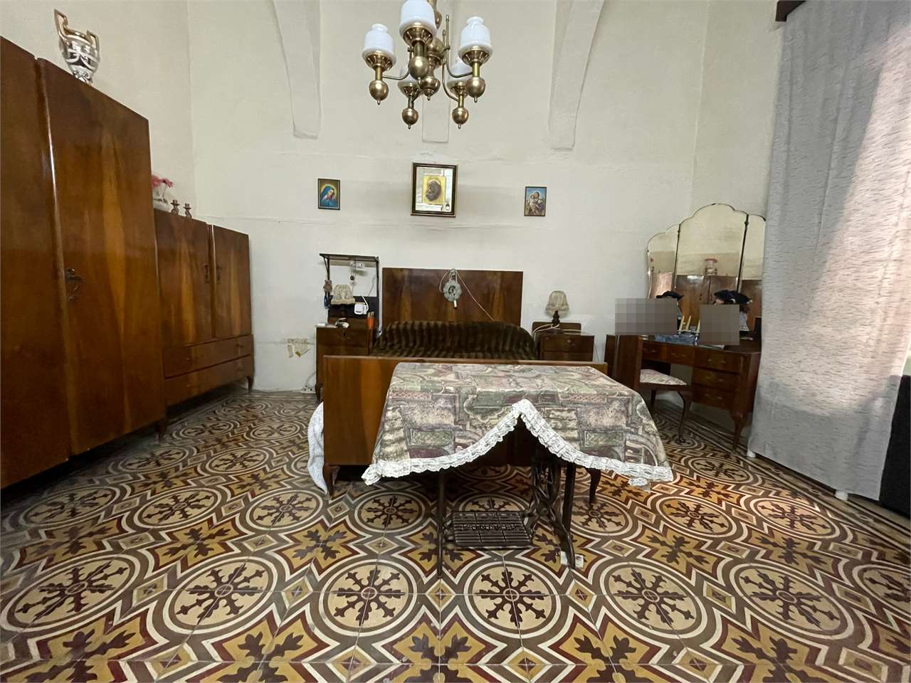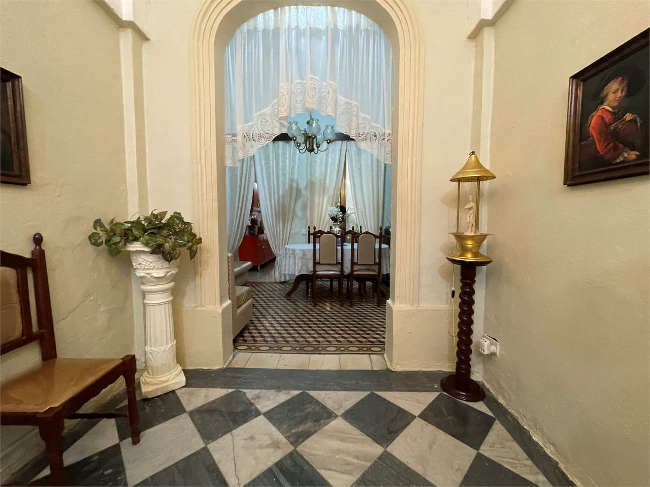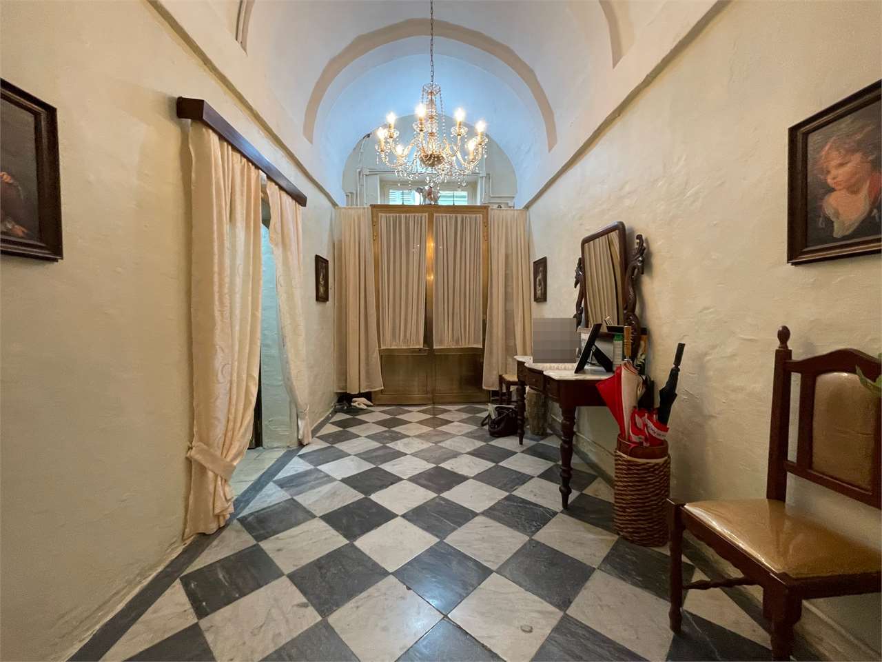 Featuring an elegant arched hallway, sitting room, dining area, kitchen, utility room, guest bathroom, and a quaint backyard with a well, the property blends modern comforts with rustic character, including original patterned tiles, a stone-arched ceiling, and a beautiful stone staircase.