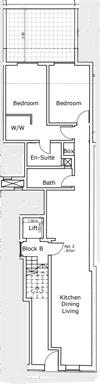 The layout includes an open-plan kitchen/dining/living area, main bathroom, master bedroom with an ensuite and walk in wardrobe, second double bedroom and a spacious back terrace of circa 20sqm, making it ideal for entertaining.