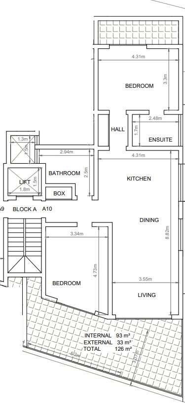This penthouse consists of an open plan kitchen/dining/living, two double bedrooms with the master including an ensuite bathroom, two terraces, main bathroom and full roof and airspace.