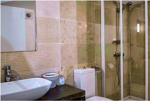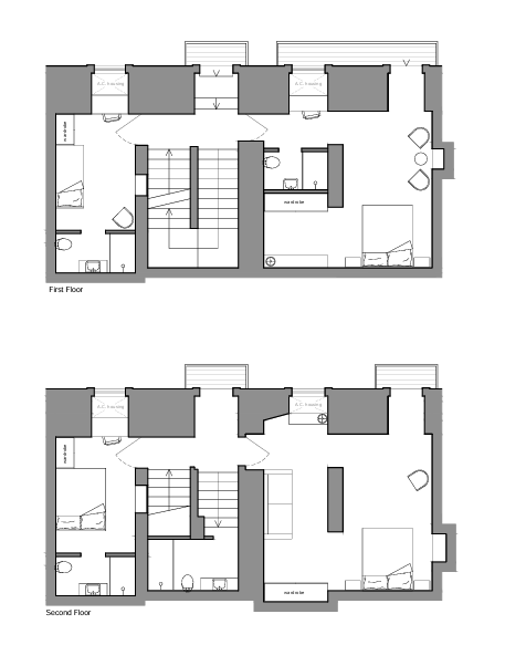 The first floor features one double bedroom and one single bedroom, both with ensuite bathrooms and AC/heating. The second floor includes two double bedrooms—one with an ensuite—and an additional bathroom.