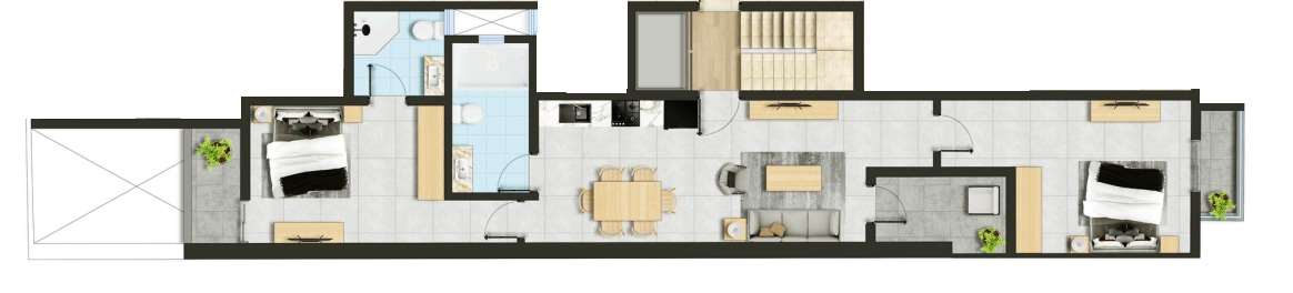 The layout comprises of an open plan kitchen/dining/living, main bathroom and two double bedrooms both of them enjoys their own balcony, the master bedroom includes an ensuite bathroom.