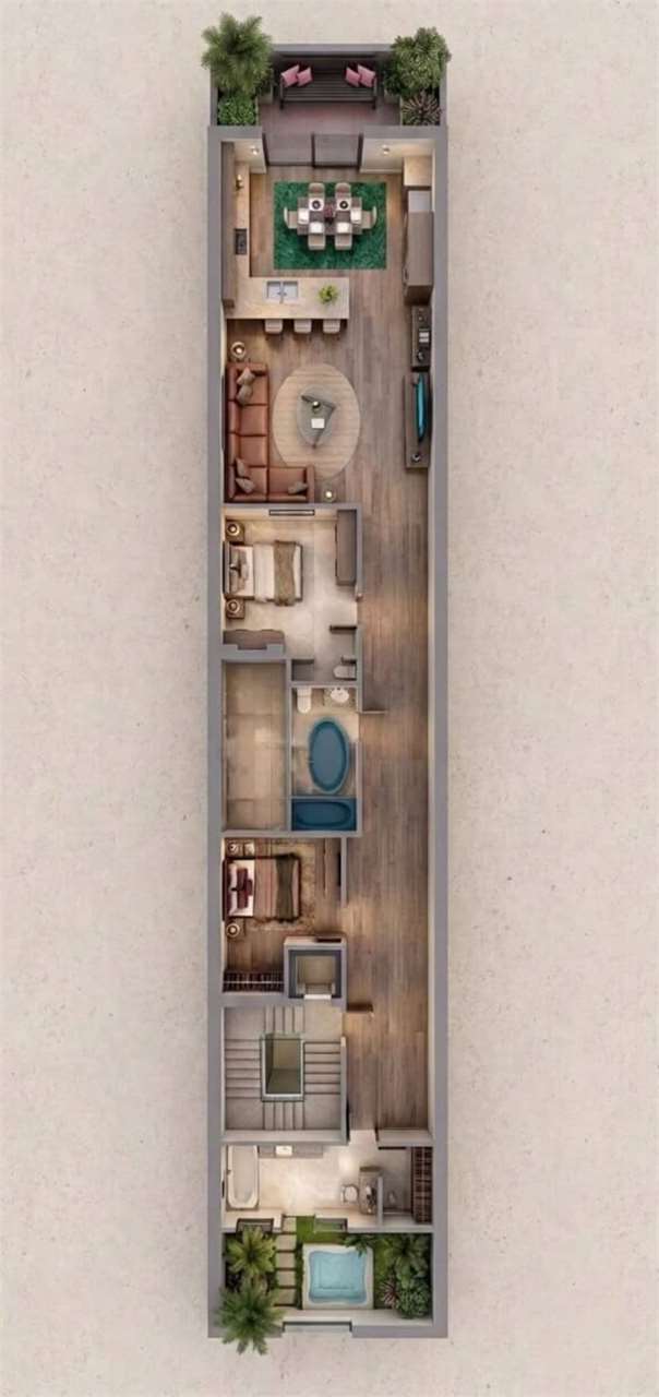 Layout comprises an open plan Kitchen/Living/Dining leading to a Terrace, three bedrooms, main with en-suite, main bathroom and a back Terrace.