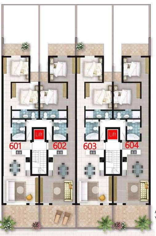 40 Electrical Points, including A/C & Telephone Points in Bedrooms & Open Plan (2 Bedroom Apartment).