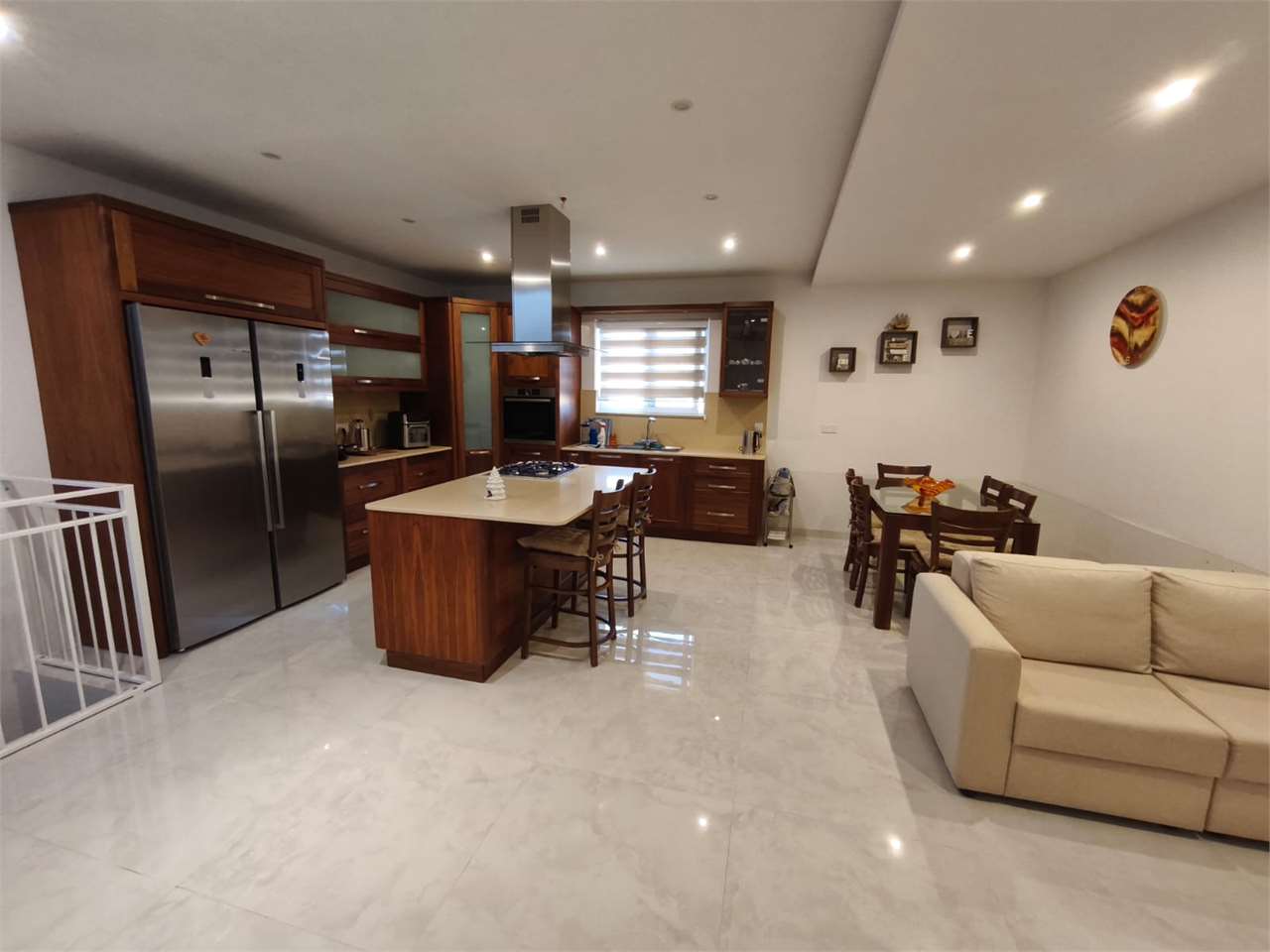 Having a squarish layout. Upon entering one finds a welcoming sitting/living, three bedrooms (master ensuite) main bathroom. On the third floor one finds a well sized kitchen/living/dining with access to the top floor where one finds the washroom with access to the roof area and unobstructed views.