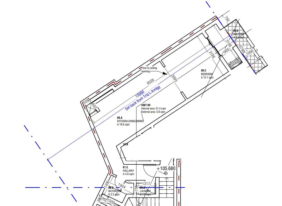 The layout comprises of an open plan kitchen/dining/living with space for a bedroom at the back connected with a balcony, main bathroom and a laundry room.