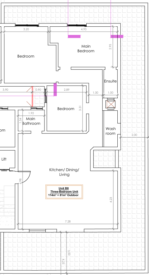 A 4th floor penthouse consisting of an open plan kitchen/living/dining overlooking a front terrace, laundry, one of the bedrooms having access to the front terrace as well, main bathroom, main bedroom with ensuite and back balcony.
