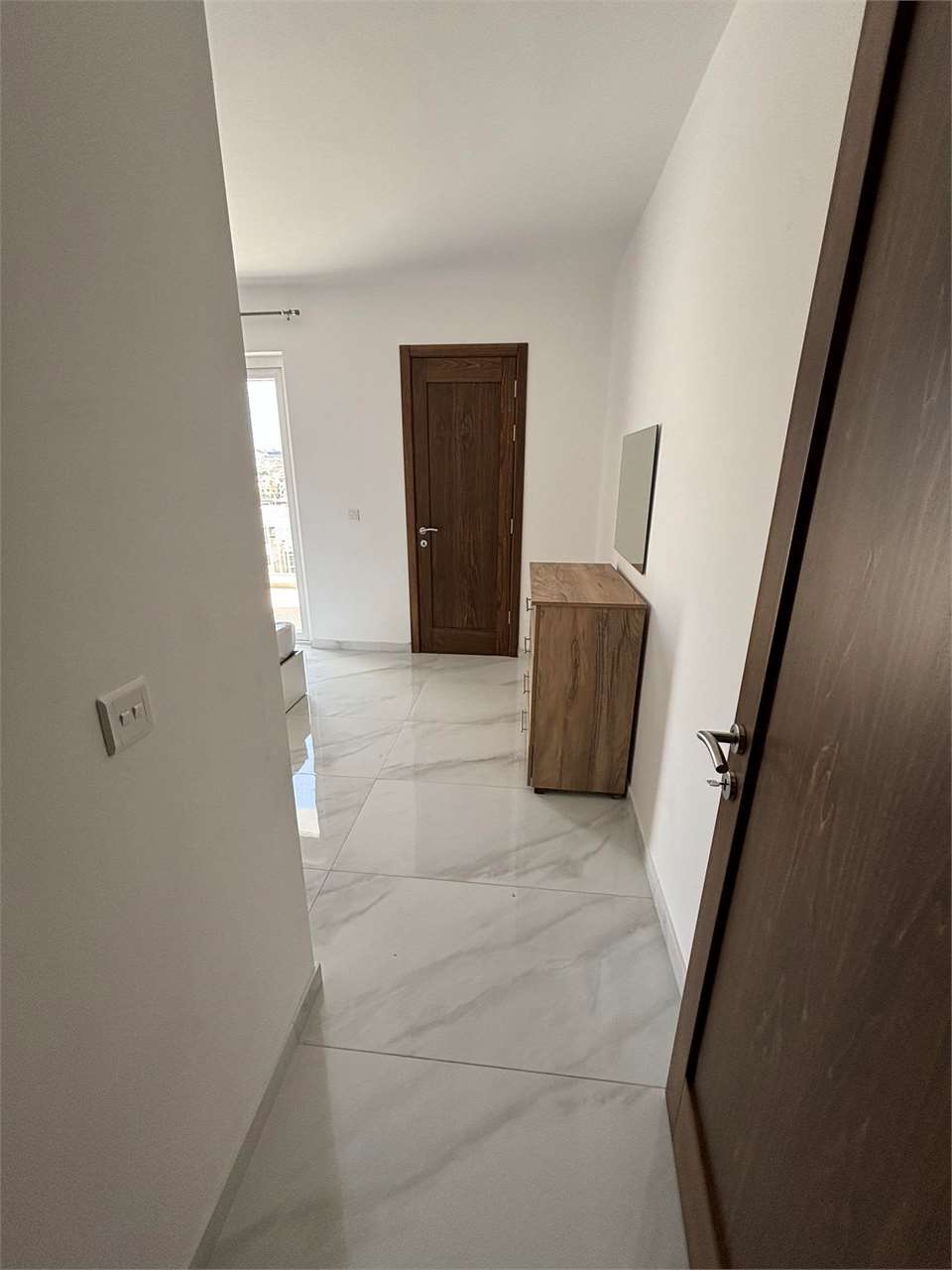 The property consists of an open plan kitchen/ living/ dining with access to a front terrace. A corridor leads to a bedroom, main bathroom, main bedroom with ensuite, and another bedroom with an ensuite and a terrace at the back. The corridor also leads to a small balcony which is a very good source of light for the property.