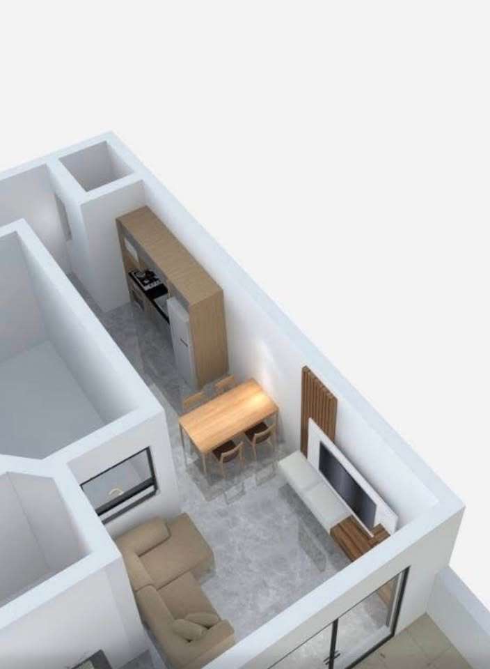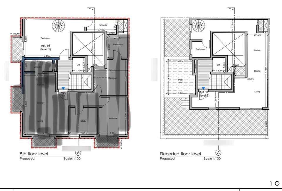 The layout comprises of an open plan kitchen/dining/living with a massive corner terrace with pool on the sixth floor, a double bedroom with a front balcony and an ensuite bathroom on the fifth floor.
