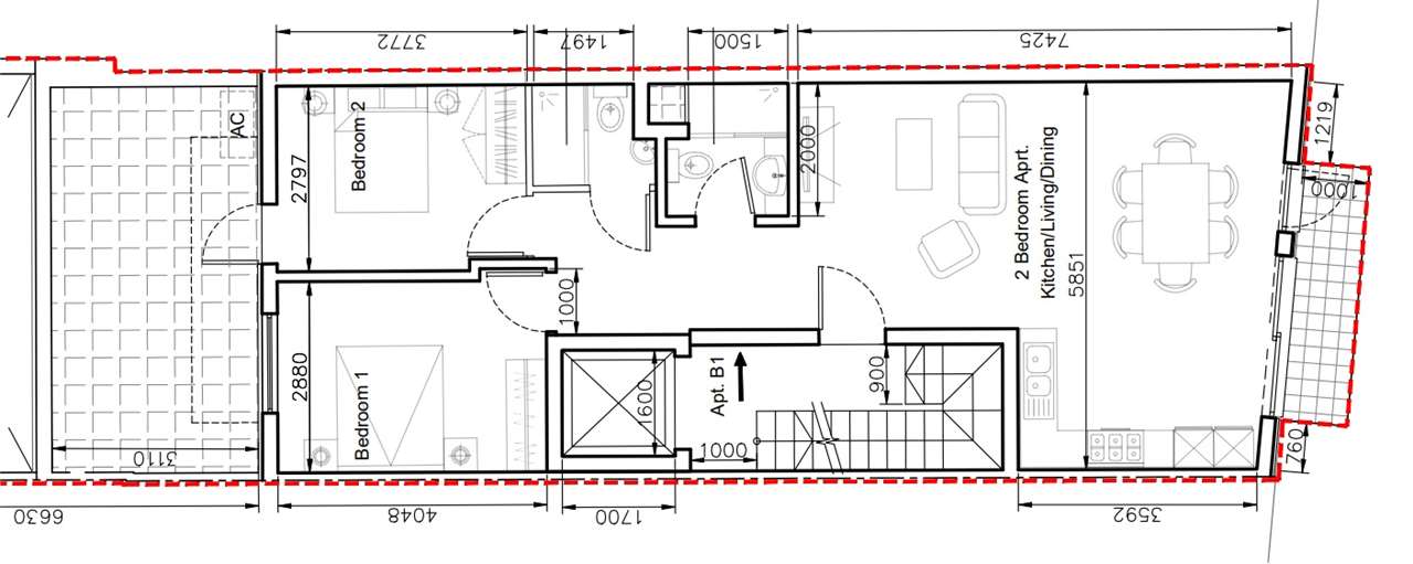 The layout comprises of an open plan kitchen/dining/living leading to a front balcony, main bathroom and two double bedrooms. The master bedroom includes an ensuite bathroom. Both bedrooms are connected to a back terrace.