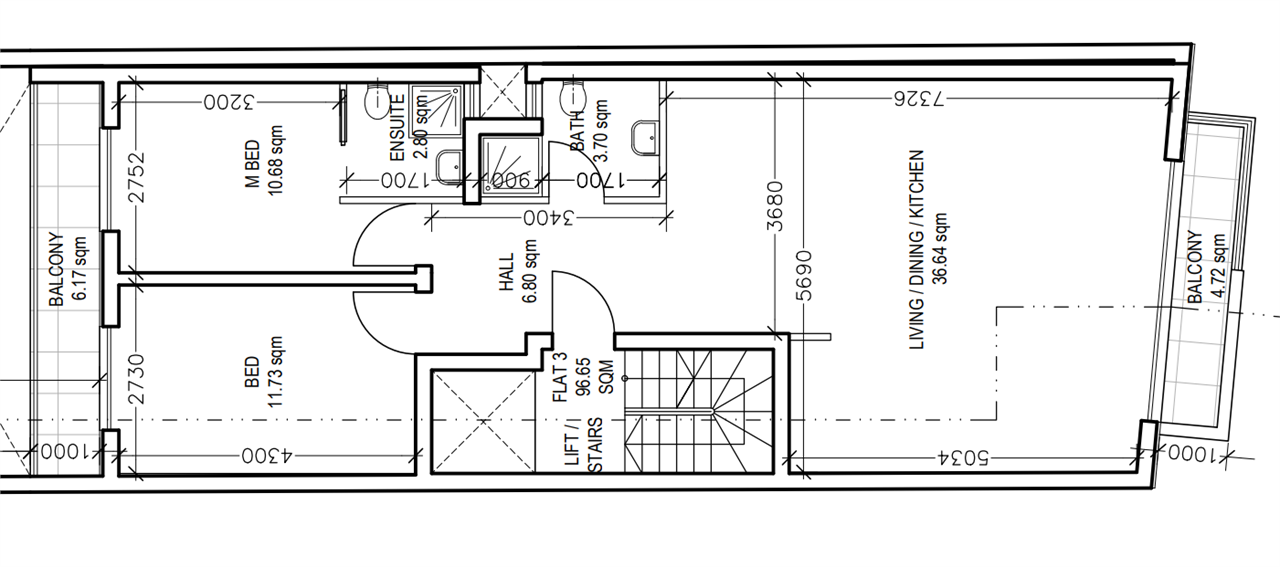 The layout comprises of an open plan kitchen/dining/living leading to a front terrace, a laundry room, main bathroom and two-bedrooms (one double and a spare). Both bedrooms are connected to a back balcony.