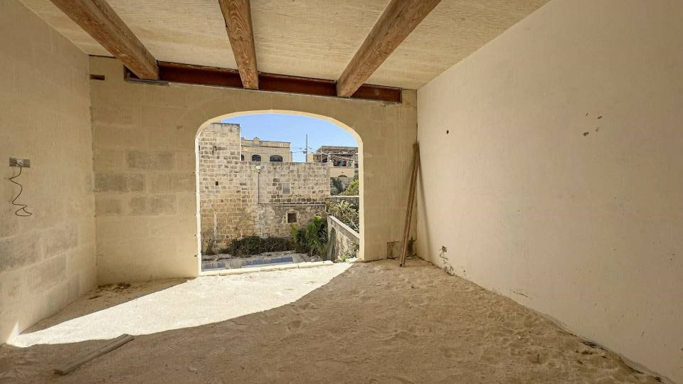 SANNAT – An exceptional, newly listed, 540 sqm farmhouse seamlessly blending historic charm with modern living, a mere 300 metres from all village amenities, is on the market for sale in the heart of Gozo. Set behind a striking 400-year-old façade and thoughtfully renovated, the property comprises a spacious 56 sqm open-plan kitchen/living/dining area overlooking the garden and an 11m x 5.5m pool, 2 generous en-suite bedrooms, a comfortable lounge, a 25 sqm central hallway as well as a room offering potential for a private spa, jacuzzi, games or entertainment room at ground-floor level. The intelligently designed layout includes 3 separate internal access doors, enabling each floor to function independently, with the first floor providing multiple spacious rooms suitable as additional en suite bedrooms, lounges or guest areas, and the second floor featuring a 57 sqm penthouse-style room with a 45 sqm front terrace commanding panoramic 180-degree views and a 20 sqm rear terrace overlooking the pool and garden. The property is equipped with double-glazed Iroko apertures, travertine marble flooring, wrought-iron railings, optional lift installation, and permits for a single garage. This rare, historic farmhouse boasting an expansive interior, independent floor access, pool & panoramic terraces offers a unique lifestyle and investment opportunity. Ideal as a luxurious private residence, high-end guesthouse, B&B, or as a boutique hotel.