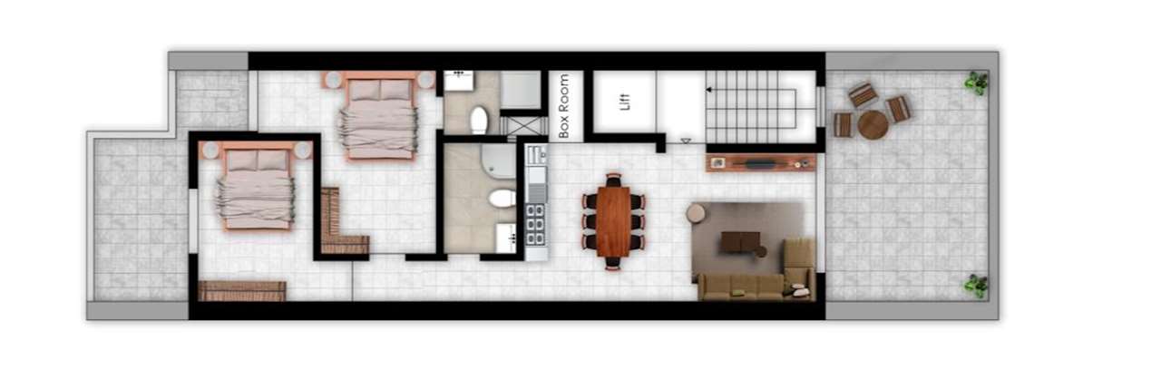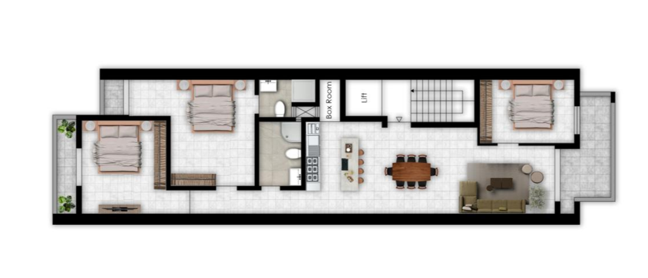 The layout comprises of an open plan kitchen/dining/living with a front balcony, a box room, main bathroom and two double bedrooms. All bedrooms has their own private balcony and the master bedroom includes an ensuite bathroom.