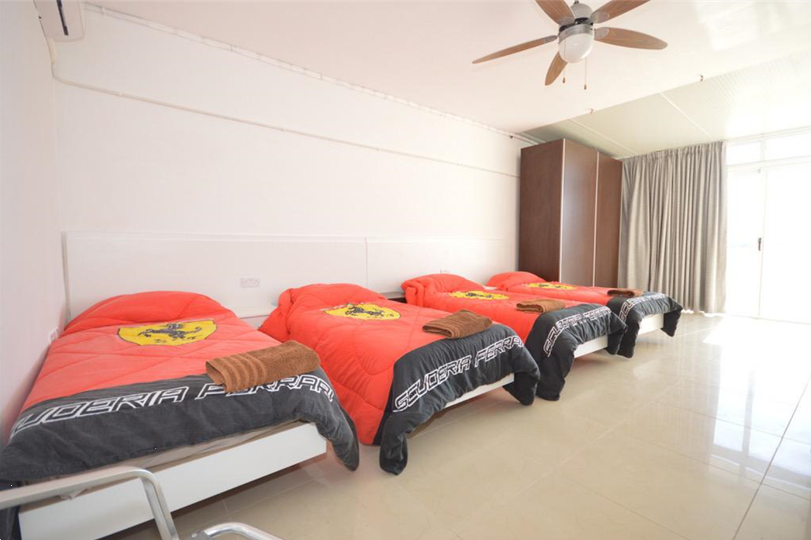 On the upper level one finds another large bedroom, which can be split in 2 bedrooms ( Currently one can see it with 4 single beds and with still plenty of space between them ) served with another large terrace and another bathroom.