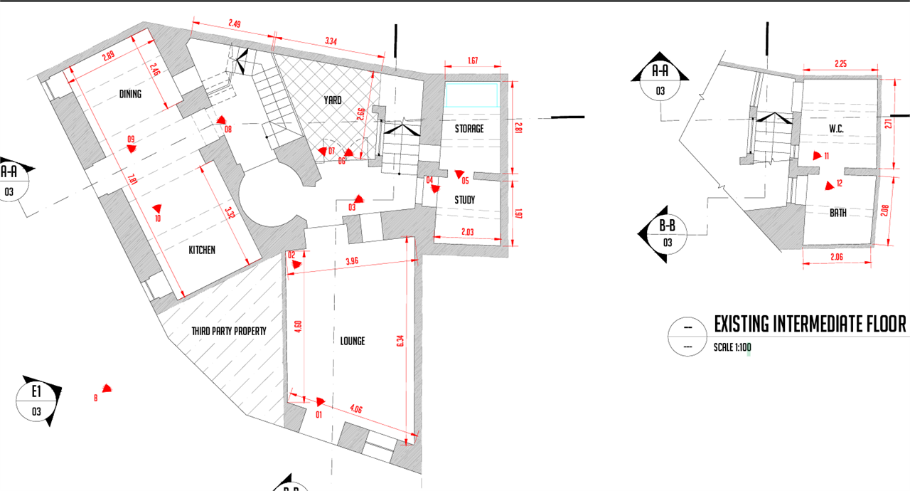Upon entrance, one is welcomed by a spacious lounge, leading onto a central courtyard that brings in natural light throughout the home. The property further comprises a kitchen and dining area, as well as a cozy study with additional storage space. An intermediate level includes a bathroom and a guest restroom.