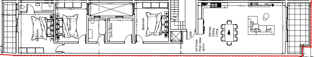 The layout comprises of an open plan kitchen/dining/living leading to a front balcony, main bathroom, a laundry room and three double bedrooms. The master bedroom includes an ensuite bathroom and is also connected to a balcony.