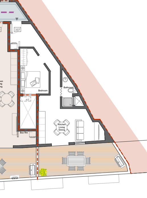 The layout comprises of an open plan kitchen/dining/living leading to a spacious front terrace, main bathroom and two-bedrooms (master bedroom and a spare). Both bedrooms are connected to a balcony and the master bedroom includes an ensuite bathroom.