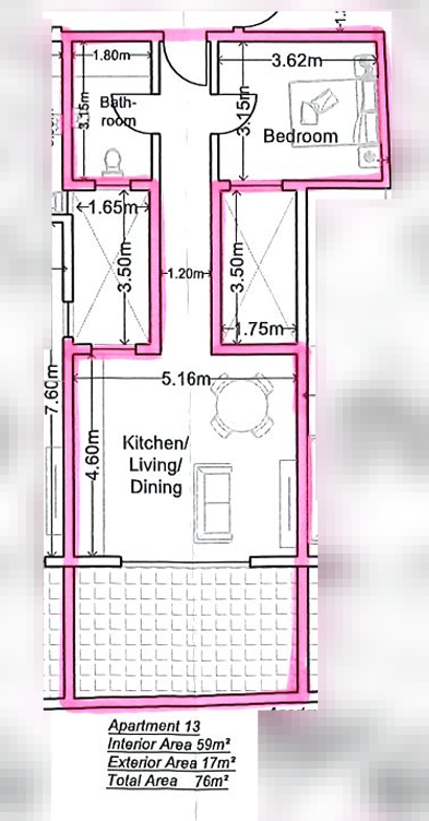 The layout comprises of an open plan kitchen/dining/living leading to a front balcony, main bathroom and two bedrooms (one double and a spare).