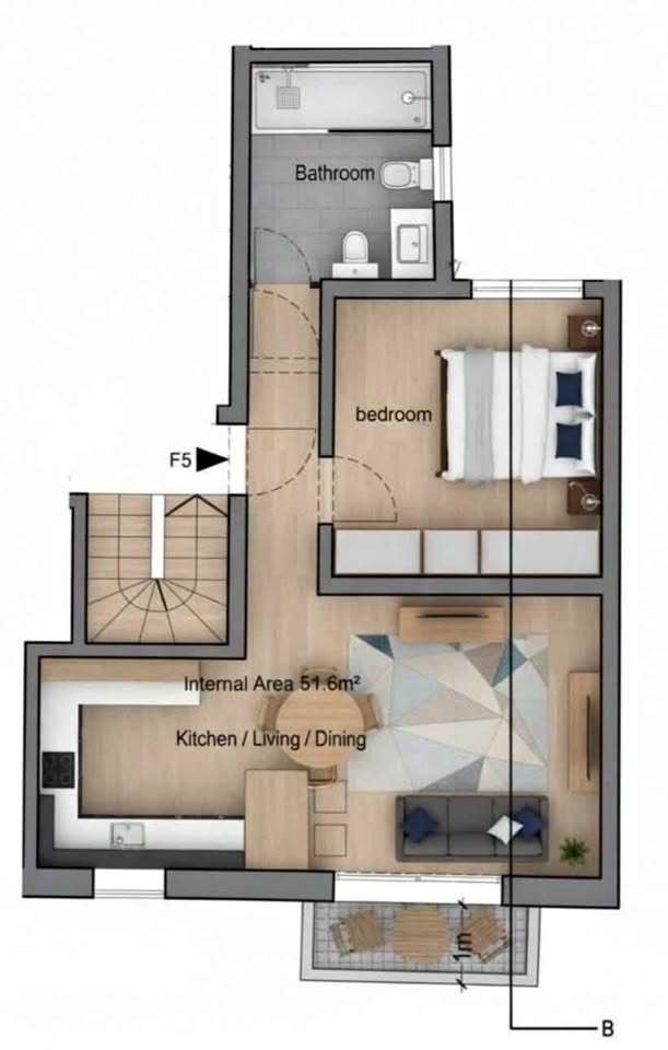 This property comprises of an open plan kitchen/dining/living with a front balcony, main bathroom and a double bedroom.