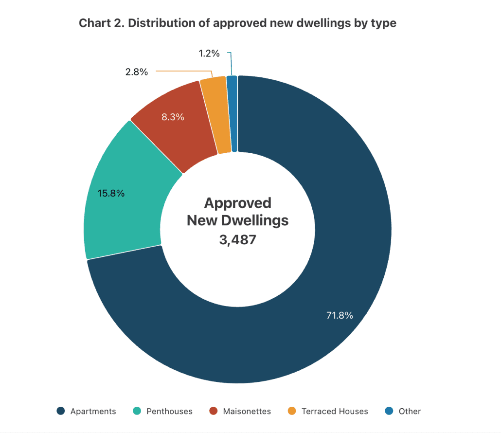 Building permits signal upcoming construction trends by approving new projects. Apartments dominated approvals at 2,505 units (71.8%), with penthouses (551), maisonettes (291), terraced houses (98) and other types (42) following. Other categories encompass bungalows, farmhouses and villas.
